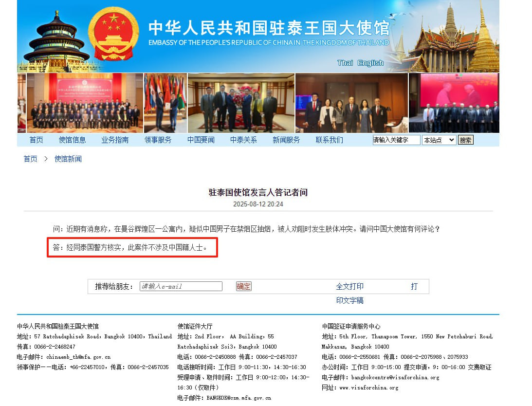 面对舆论发酵,中国驻泰国大使馆第一时间关注事件进展,并与泰国警方核实情况。使馆发言人表示,经过警方确认,涉事人员并非中国籍,与中国公民无关。发言人强调:“希望媒体和公众理性看待网络信息,不要被未经证实的传言误导。”